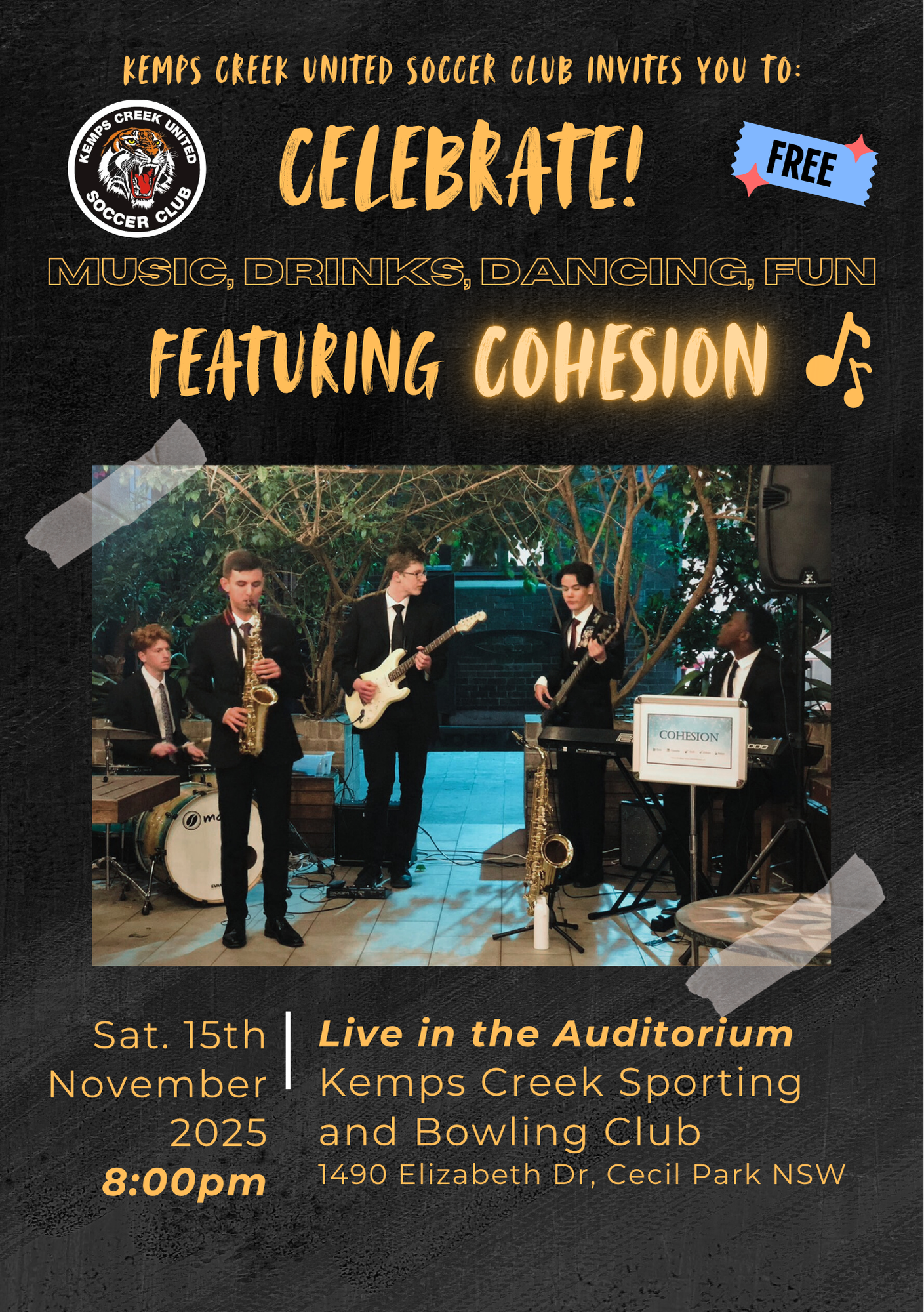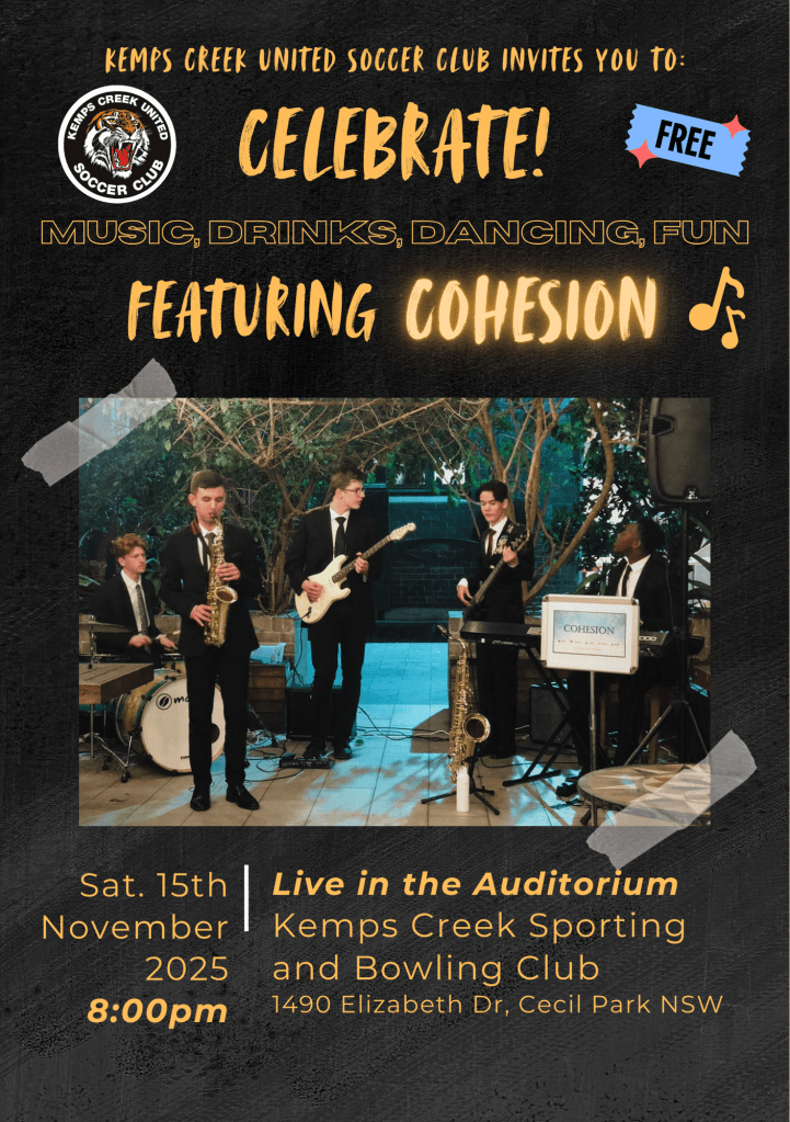 Kemps Creek United Soccer Club invites you to join us as we enjoy great live music, relax, and celebrate another fantastic season before we gear up for an even bigger year ahead